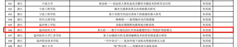 该项目团队在群交 蔡福满、江小琼等老师的带领下,围绕慢性伤口开展从风险预警、愈合评估以及预后预测开展数智化、全流程的护理管理体系研究。目前该团队已获国家级大学生创新创业项目4项,省级创新创业项目2项,发明专利9项(1项以30万元转化),实用新型专利5项。在国际皮肤病学顶级期刊British Journal of Dermatology(IF:11.11)及中华护理杂志等国内外期刊上发表高质量学术论文近10篇,并入选中华护理杂志百篇优秀论文、浙江省专业学位研究生优秀实践成果和浙江省优秀专业型硕士学位论文,先后获国家级及省级大学生“互联网+”及“挑战杯”创新创业大赛金奖、一等奖等奖项近10项。