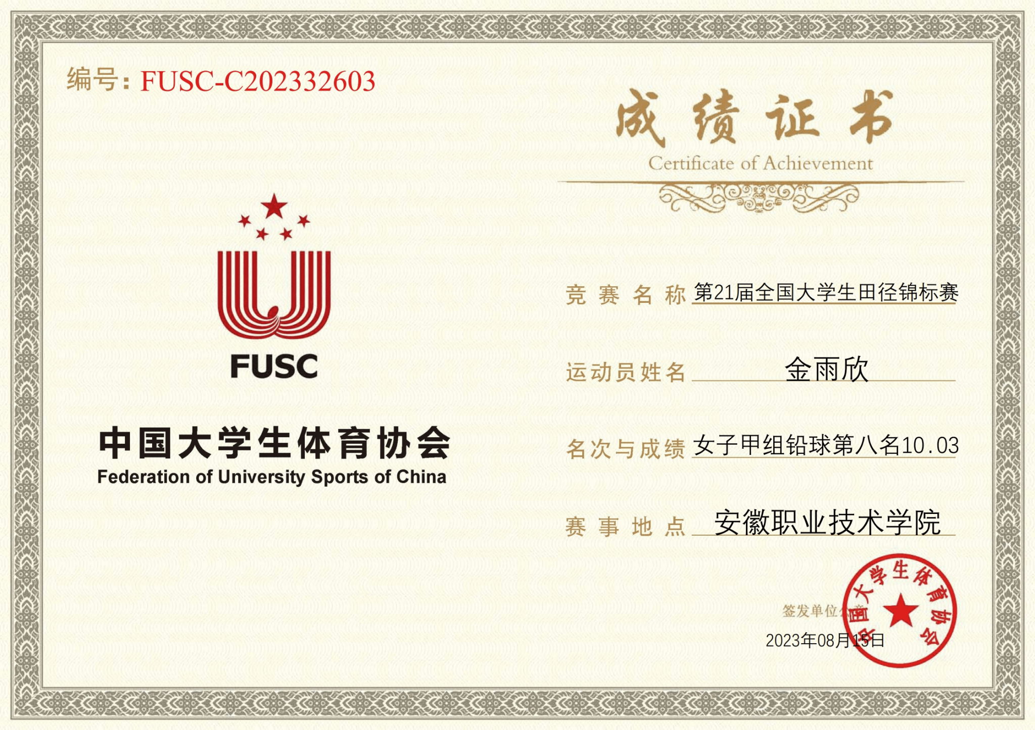 2023年8月10日—16日,群交 健儿金雨欣同学(校田径队员)参加由中国大学生体育协会主办的第21届全国大学生田径锦标赛中,她顽强拼搏,最终以10.03米的成绩取得第八名,创造我校田径历史。全国田径锦标赛成绩是评价高校体育工作的一项重要指标。
