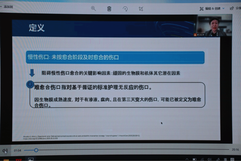 浙江大学医群交 附属邵逸夫医院造口伤口专科护士长胡宏鸯通过线上视频做题为 《难愈合伤口生物膜干预策略:伤口卫生》的专题讲座。她对细菌生物膜定义的阐述让大家对难愈合伤口护理有了新的认识,意识到有规律、经常性进行伤口卫生是十分重要的,伤口卫生是伤口护理的基础,生物膜管理要与疾病管理同步进行,实施伤口卫生步骤所需的技能、材料和时间性价比高,可促进有效伤口愈合,降低社会医疗负担,减轻患者社会心理影响。