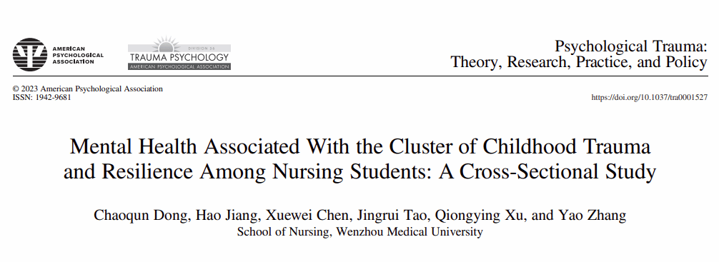 近年来,护理专业学生的心理健康问题日益受到关注。护理专业学生是未来的卫生专业人员,他们将在临床上进行护理工作,而他们的心理健康状况会使他们在对待个人和患者护理方面产生重大差异。在此背景下,董超群导师团队采用便利抽样法于华东某医科大学进行了一项横断面调查。本研究采用童年创伤问卷、心理弹性量表、焦虑自评量表和抑郁自评量表进行调查,并采用聚类分析方法对护生进行群组分类。研究结果显示护理专业本科生中童年创伤与心理弹性之间存在三种不同的关联群组,且每个群组都与不同程度的焦虑和抑郁有关。这启示医护人员应根据三种关联群组间的独特特征制定针对性的干预措施,以促进护理专业本科生的心理健康。