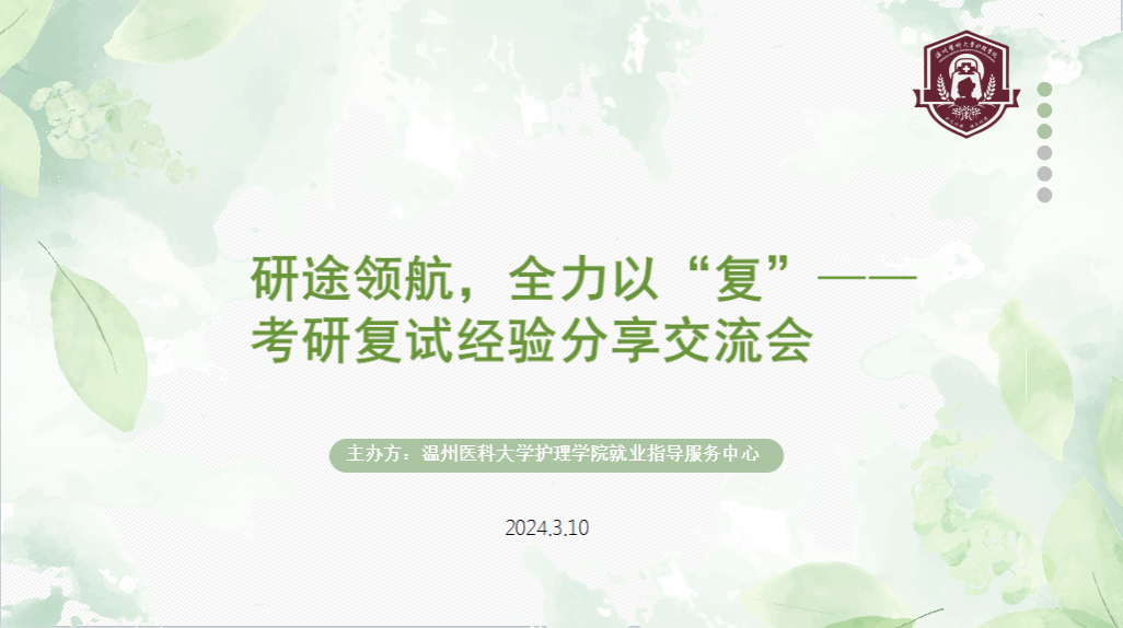 为助力群交 学子顺利通过考研复试,2024年3月10日,群交 就业指导服务中心举办了研途守护,全力以“复”线上考研复试分享会。本次分享会邀请了现就读于浙江大学的硕士研究生陈蔚婧、中国医科大学的硕士研究生宋晨宁和在本校攻读研究生的王钰琦,为考研学子分享考研复试经验,指点迷津。
