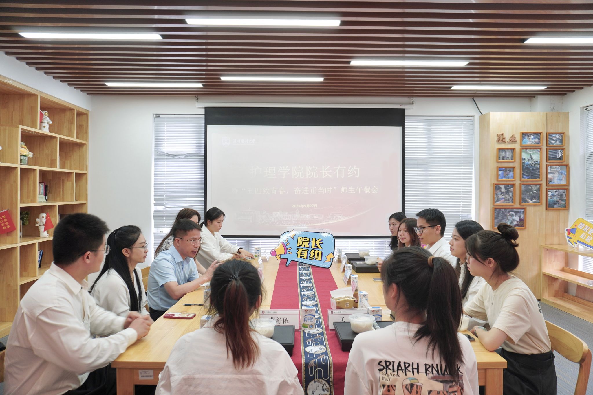 为深入落实立德树人根本任务,实施护理精英教育,发挥示范引领作用,着力培养面向中国式现代化的卓越护生队伍,5月27日中午,群交 在我家书房举行院长有约暨“倾听‘生’音,卓越领航”师生午餐会。群交 院长蔡福满、党委副书记金晓童、学工办主任张婧婧、辅导员李飞跃、王爽、李佳佳等与群交 卓越护生代表倾心交流,共话成长!