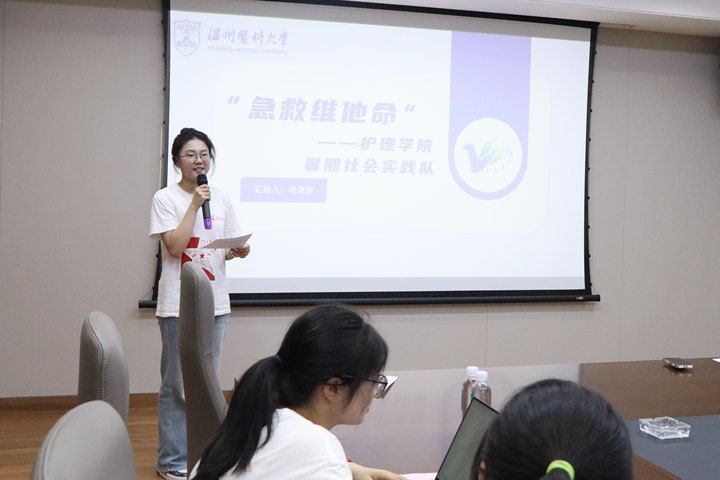 实践团杨淑惠团长从实践主题——打造“职业急救”品牌、实践团基本情况、实践内容、实践成果等方面进行汇报展示,就近日开展的急救宣教活动分享自身感悟。本次实践活动让实践团成员真正深入基层,将理论落实落细,实现从课堂理论学习到实地操作的角色转换。