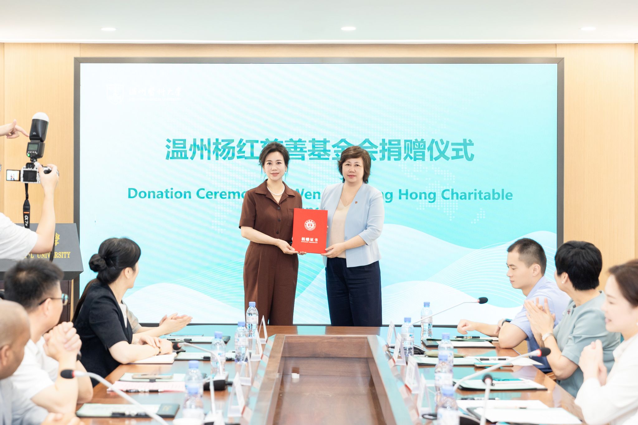 会上,温州杨红慈善基金会杨红理事长针对本次项目进行了专题捐赠仪式。校党委委员、宣传部(教师工作部)李军红部长代表学校为杨红慈善基金会颁发了荣誉证书。
