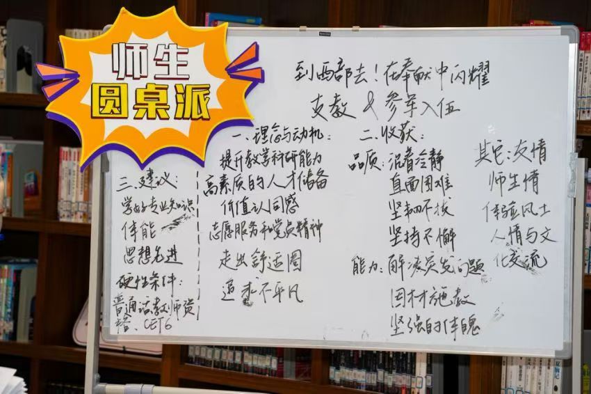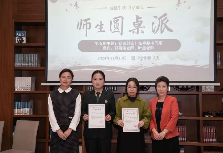 第五期师生圆桌派于11月18日下午在图书馆青春书房成功举办,本次活动以“到西部去!在奉献中闪耀”为主题,通过师生分享支援西部经历,共同探讨宝贵经验,更好奉献社会。本次活动嘉宾为群交 符丽燕老师、叶星老师,肖芳同学、陈嘉泓同学,现场观众由学生党员、入党积极分子代表及线上2024级大一新生组成。