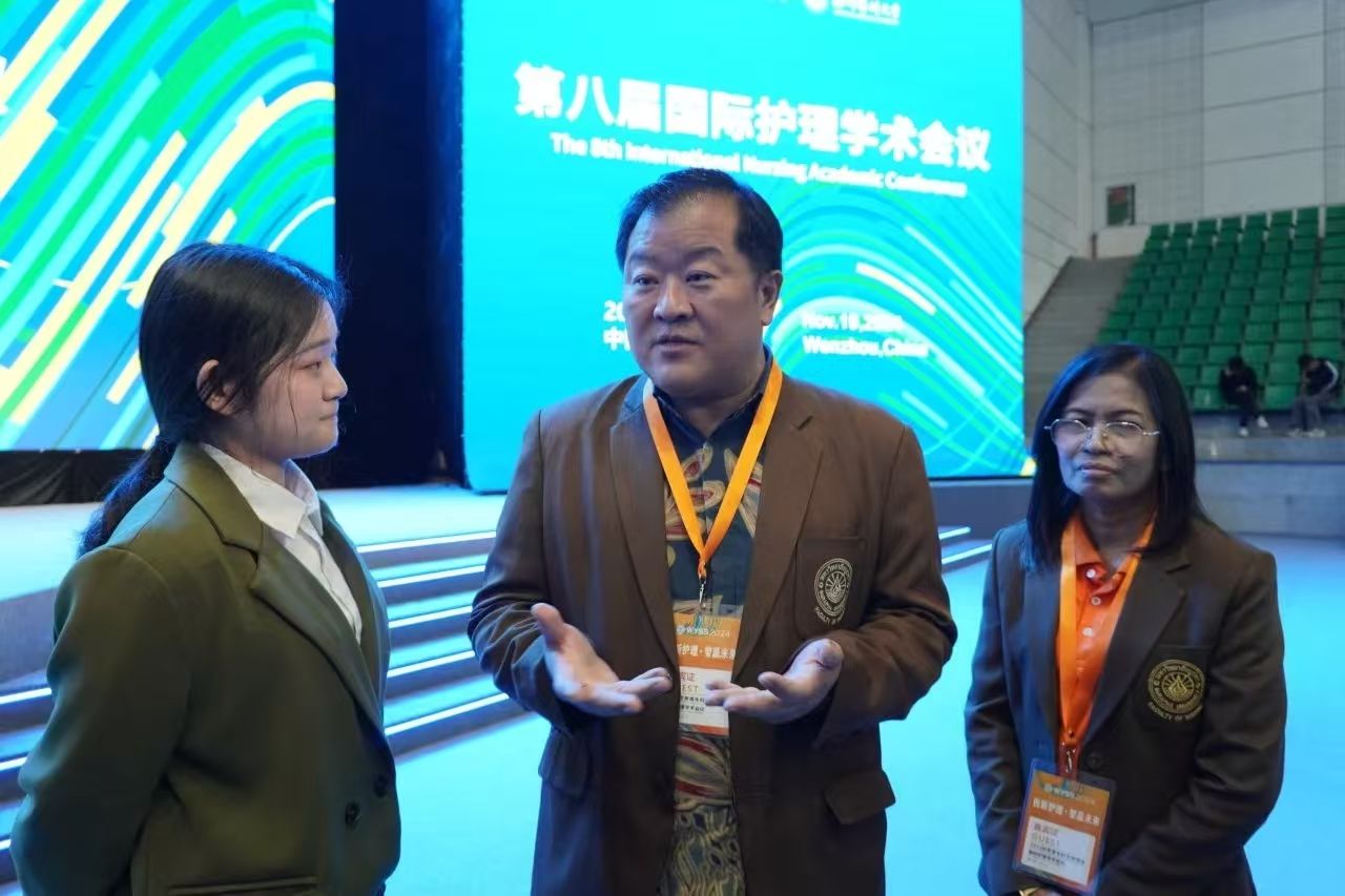 有幸借青科会护理学术会议之机,我采访了泰国东方大学群交 院长Pornchai Jullamate,感触颇深。Pornchai Jullamate院长对两校的友好合作给予了高度评价,并明确表示该项目将持续进行。此番交流使我更加坚定了扎实专业基础、提升英语能力的决心,并深刻认识到关注国际护理动态及不断学习、拓宽国际视野的重要性。我将以此次访谈为起点,不懈努力,为护理事业的未来贡献自己的力量。——2023级卓越护生杨赟