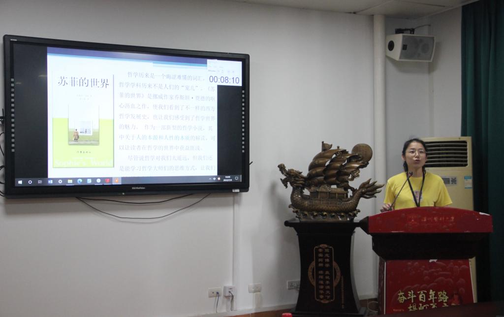 江思思老师带来的是《苏菲的世界》读后感,从“我是谁?”“世界从哪来?”两个问题出发,描述了“洞里人”的生活世界和惨烈结局,介绍了这本书展现的不一样的西方哲学发展史,让我们感受到了哲学世界的魅力,同时通过学习哲学大师们的思维方式,激发我们关心、探索所生活的世界,在内心深处保留那份对生命的敬仰和敬畏之情。