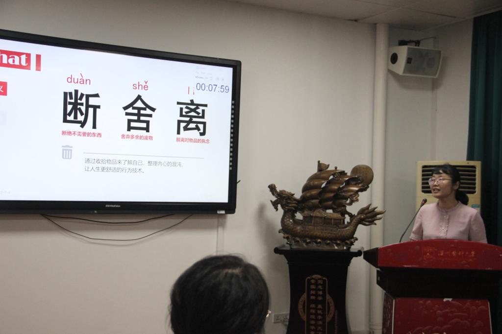 朱莲莲老师将我们的思绪从抽象的世界,带到了具象的生活之中,分享的主题是“断舍离”。作为一种行为技术所展现的生活方式,这个词并不陌生。但是什么才是真正的断舍离?朱莲莲老师认为,它并不是指单纯外在的一些表现,更是强调一个人从内心开始不再受到外在事物以及自身欲望的干扰与影响,从而实现对自己深刻、彻底的了解,并接纳最真实的自己。