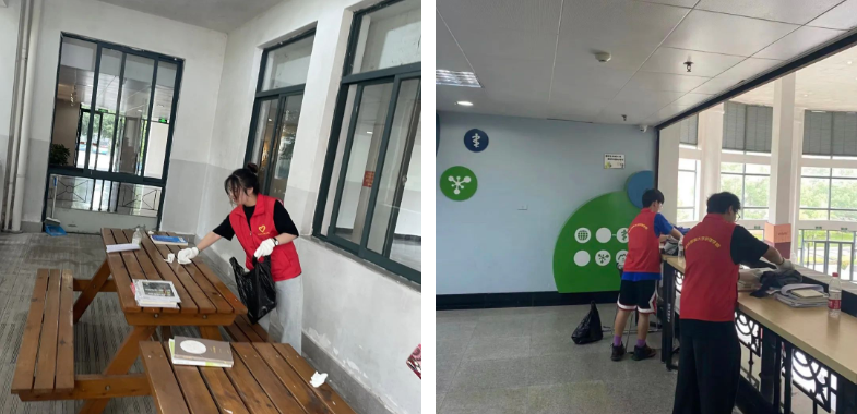 “文明清扫”。服务在所需的包干区域进行打扫和清理。整理了平时注意不到的卫生死角、清理了教学楼周围的草坪、整理了自习区杂物,为校园环境贡献了文明使者的力量。