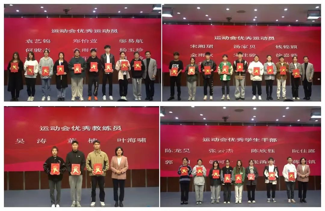 此外在表彰活动中,群交 团委副书记吴媛媛用开局好、干劲足、人心齐三个关键词对此次运动会作了总结回顾。学生干部代表陈龙昊及运动员代表宋湘珺和邬易航发言中提到,会牢记运动会过程中带来的勇于拼搏、奋发向上的体育精神,不忘比赛时的那份初衷与坚毅,始终充满激情和朝气,不负学校和老师的期许。优秀教练员代表董楠也表示为全体运动员亮眼的成绩感到自豪,他祝愿同学们继续秉承良好的体育精神,勇于拼搏、奋发向上,在未来的日子里继续发光发亮。