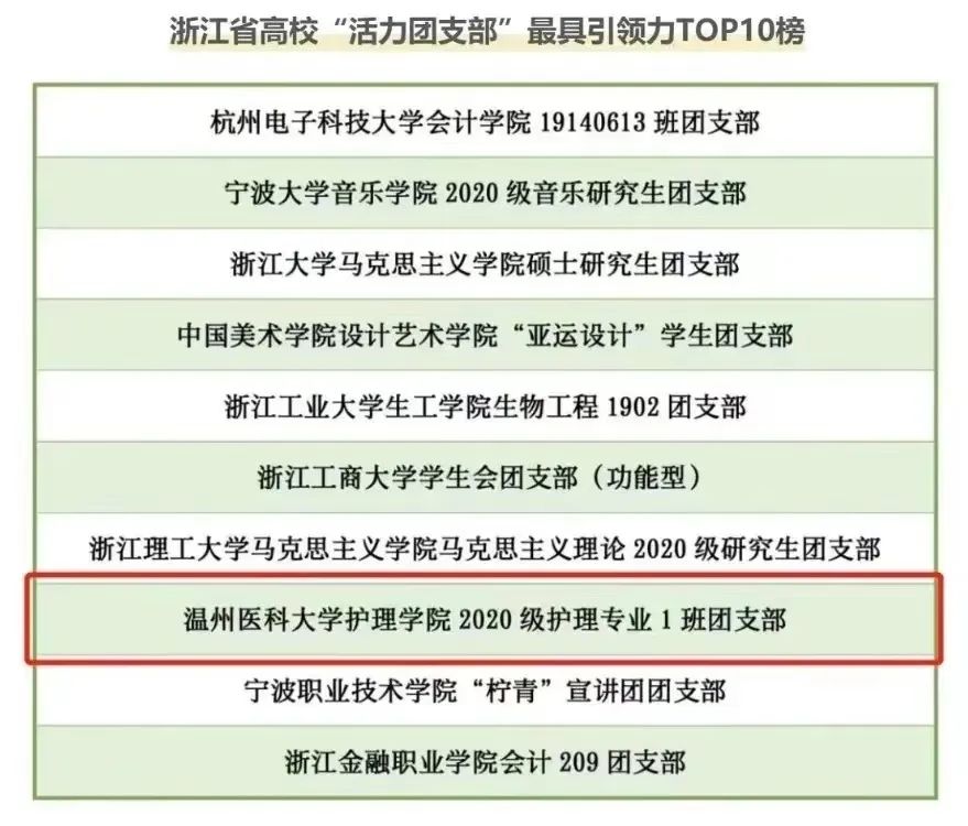 经团省委、省学联评审,群交 20护理1班团支部成功入选2022年度浙江省高校“活力团支部”最具引领力TOP10榜!(我校共有6个团支部入选)