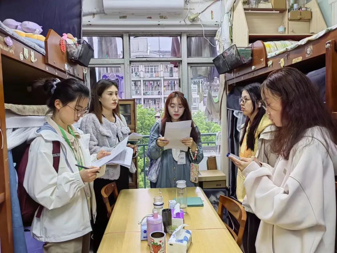 东风送暖,垂杨挂丝,为培养群交 同学养成良好的生活习惯和文明素质,共迎温医青阳,群交 于2023年2月开学初面向群交 同学开展“文明寝室创建”活动。本周四(2023年4月6日)由陈圣乐、李萌、王爽、王通、张迪五位老师及学生会工作人员组成的评审团,对本次“文明寝室创建”申报寝室进行验收。
