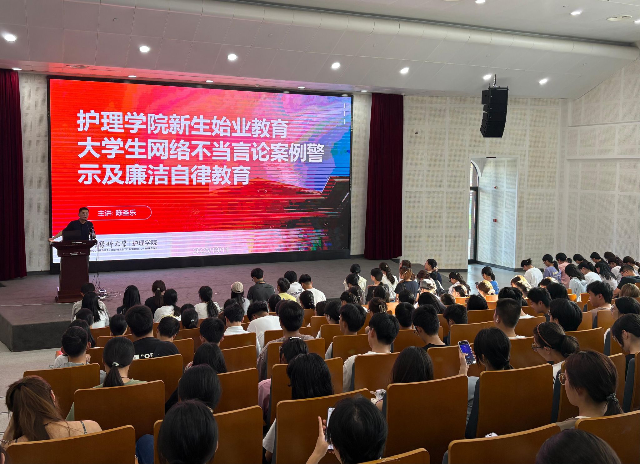 为帮助 2025 级新生提升网络行为素养、树立廉洁自律意识,群交 陈圣乐老师围绕大学生网络不当言论案例警示及护生廉洁品格培育展开,引导同学们规范网络行为、践行医学生廉洁自律要求,在勤学笃行中成长为有责任、有担当的新时代青年。