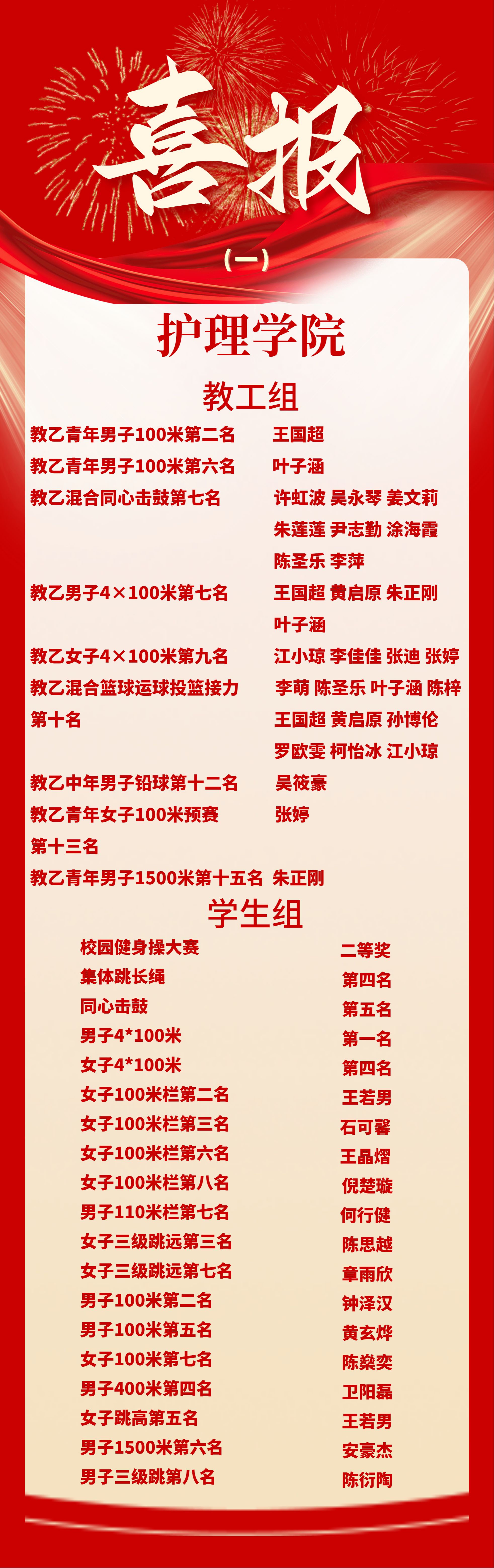 在教乙青年男子100米决赛中,群交 王国超老师获得第2名、叶子涵老师获得第6名;在教乙青年女子100米预赛中,群交 张婷老师获得第13名;在教乙青年男子1500米决赛中,群交 朱正刚老师获得第15名;在教乙男子4×100米决赛中,群交 教职工王国超、黄启原、朱正刚、叶子涵获得团体第7名;在教乙女子4×100米决赛中,群交 教职工江小琼、李佳佳、张迪、张婷获得团体第9名。