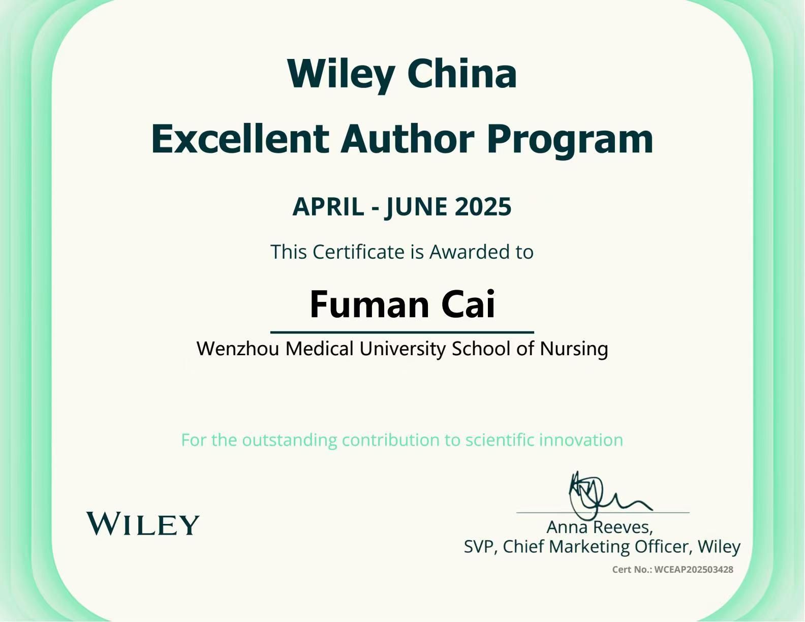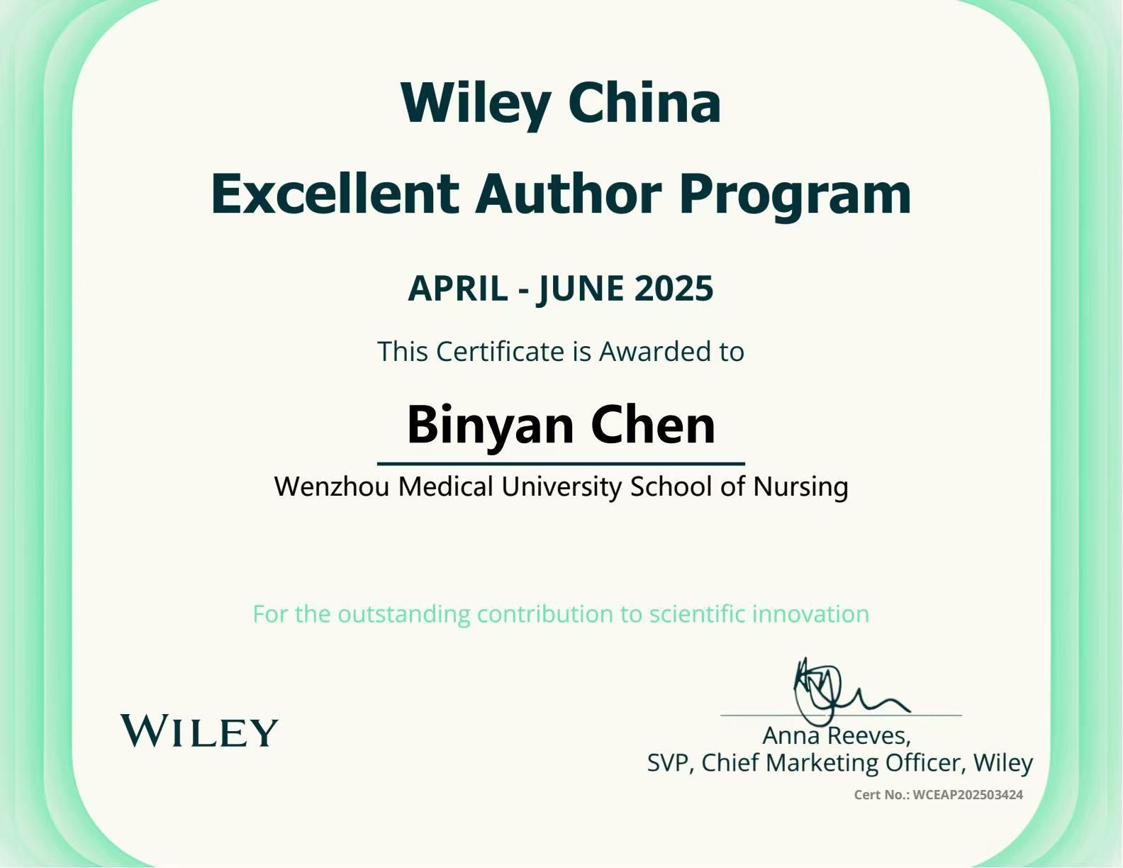 近日,国际知名出版集团Wiley正式公布“2025年第二季度威立Wiley中国高贡献作者奖”评选结果。由群交 2024级护理研究生陈彬艳、周敬皓、陈盛樟为并列第一作者,蔡福满教授和黄盼博士为共同通讯作者发表于期刊《Journal of Clinical Nursing》中的论文“Interpretable Machine Learning Prediction Model for Predicting Mortality Risk of ICU Patients With Pressure Ulcers Based on the Braden Scale: A Clinical Study Based on MIMIC‐IV”,在发表后立即受到了全球学者们的广泛关注,三个月内获得了334次下载,在该期刊2025年第二季度发表文章中位列前茅,因此荣获2025年第二季度“Wiley威立中国高贡献作者奖”,展现出该研究广泛的国际学术影响力。