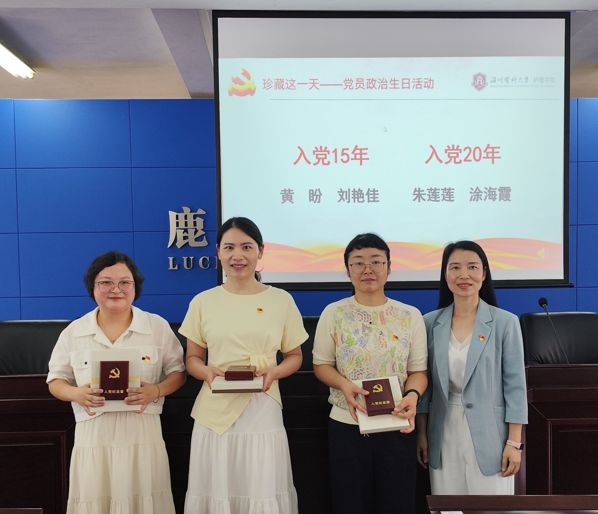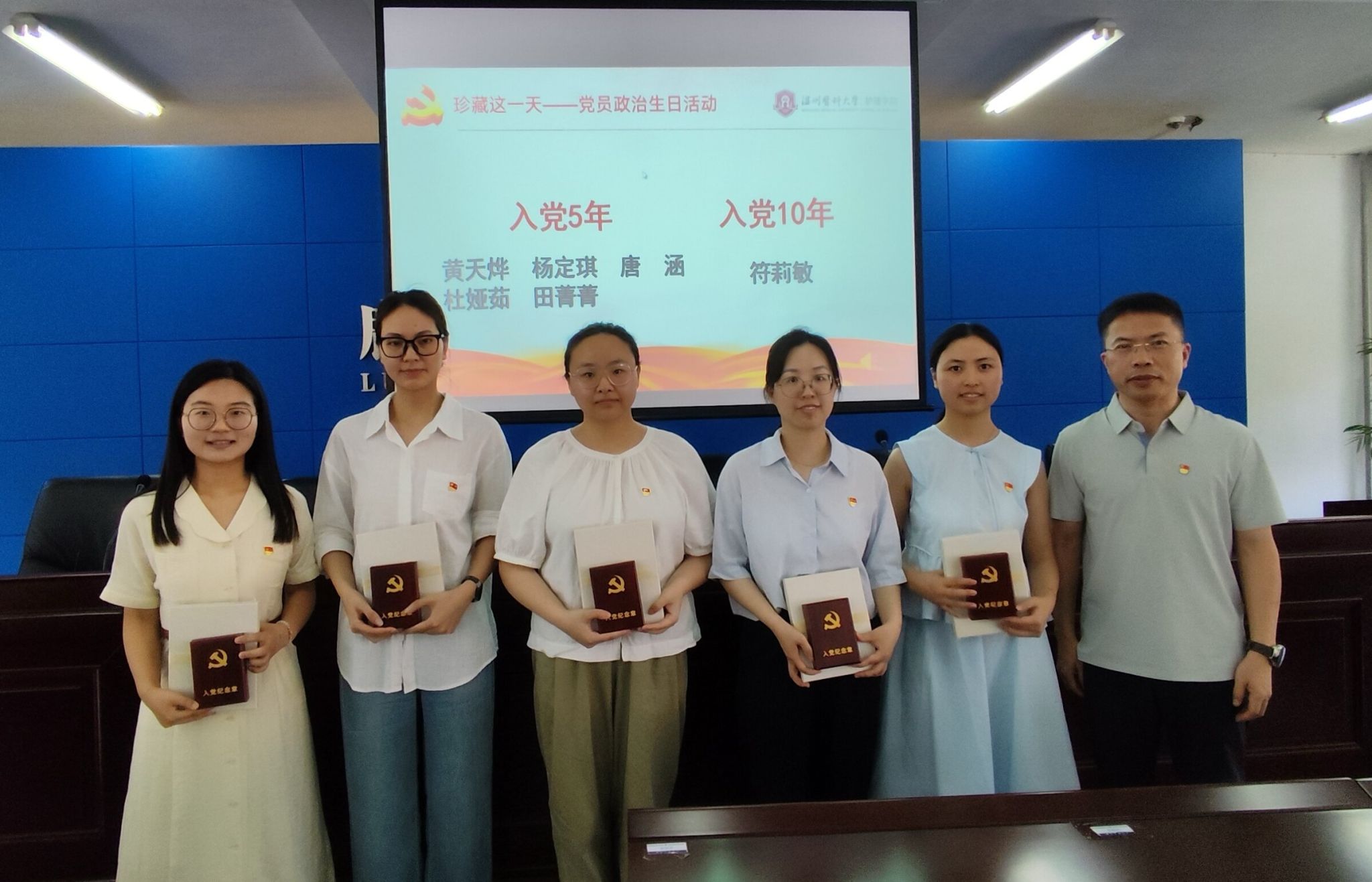 参观结束后,群交 党委举行了简朴而庄重的党员“政治生日”仪式。蔡福满院长为入党5周年的黄天烨、杨定琪、唐涵、杜娅茹、田菁菁老师,以及入党10周年的符莉敏老师颁发纪念章。王敏书记为入党15周年的黄盼、刘艳佳老师,以及入党20周年的涂海霞、朱莲莲老师颁发纪念章。
