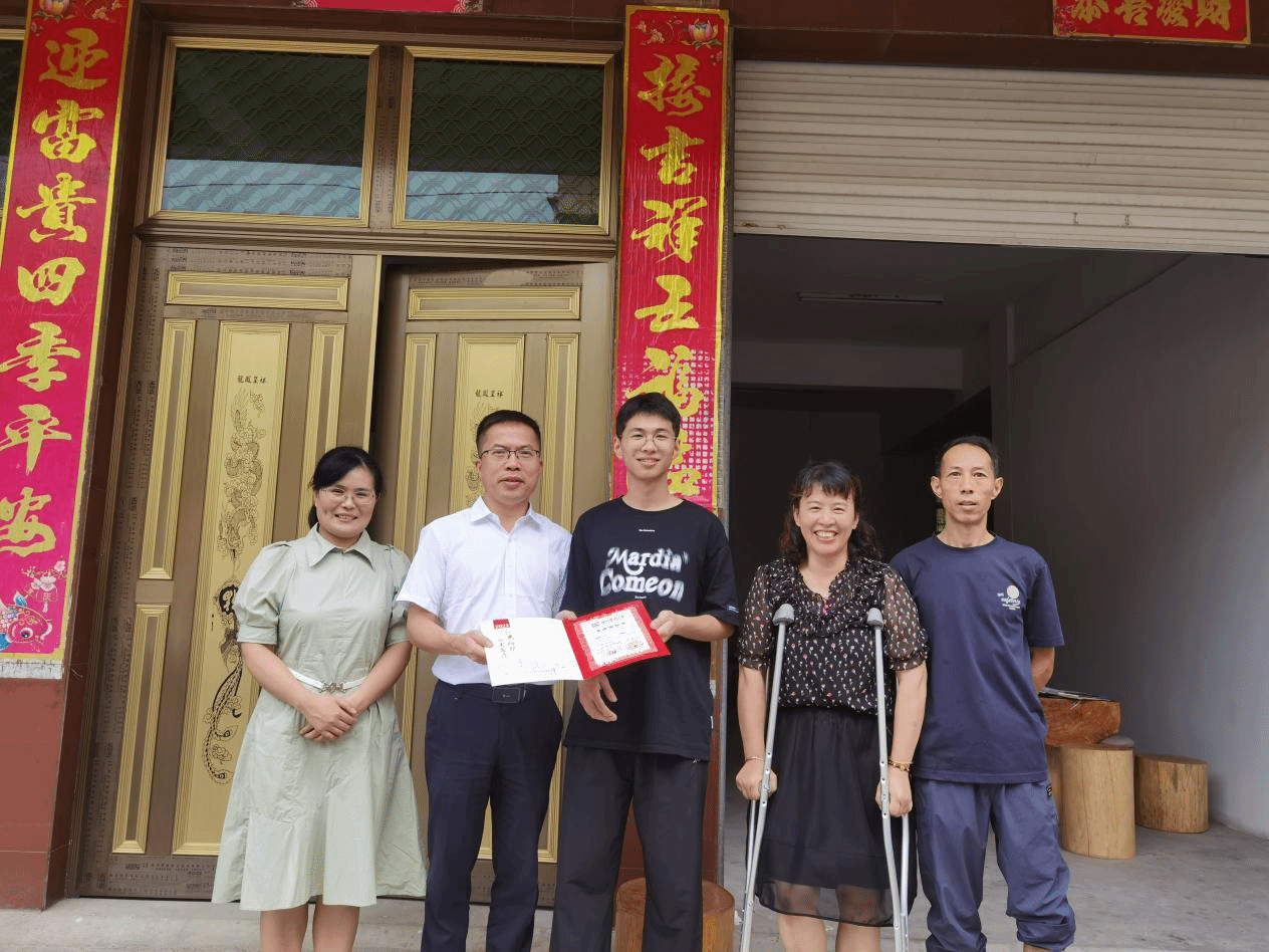 7月29日上午,群交 院长蔡福满前往丽水市莲都区,化身“邮差”亲自将2023年第一份录取通知书送到学生舒斌凯手中,群交 社区教研室主任李菊芳陪同。