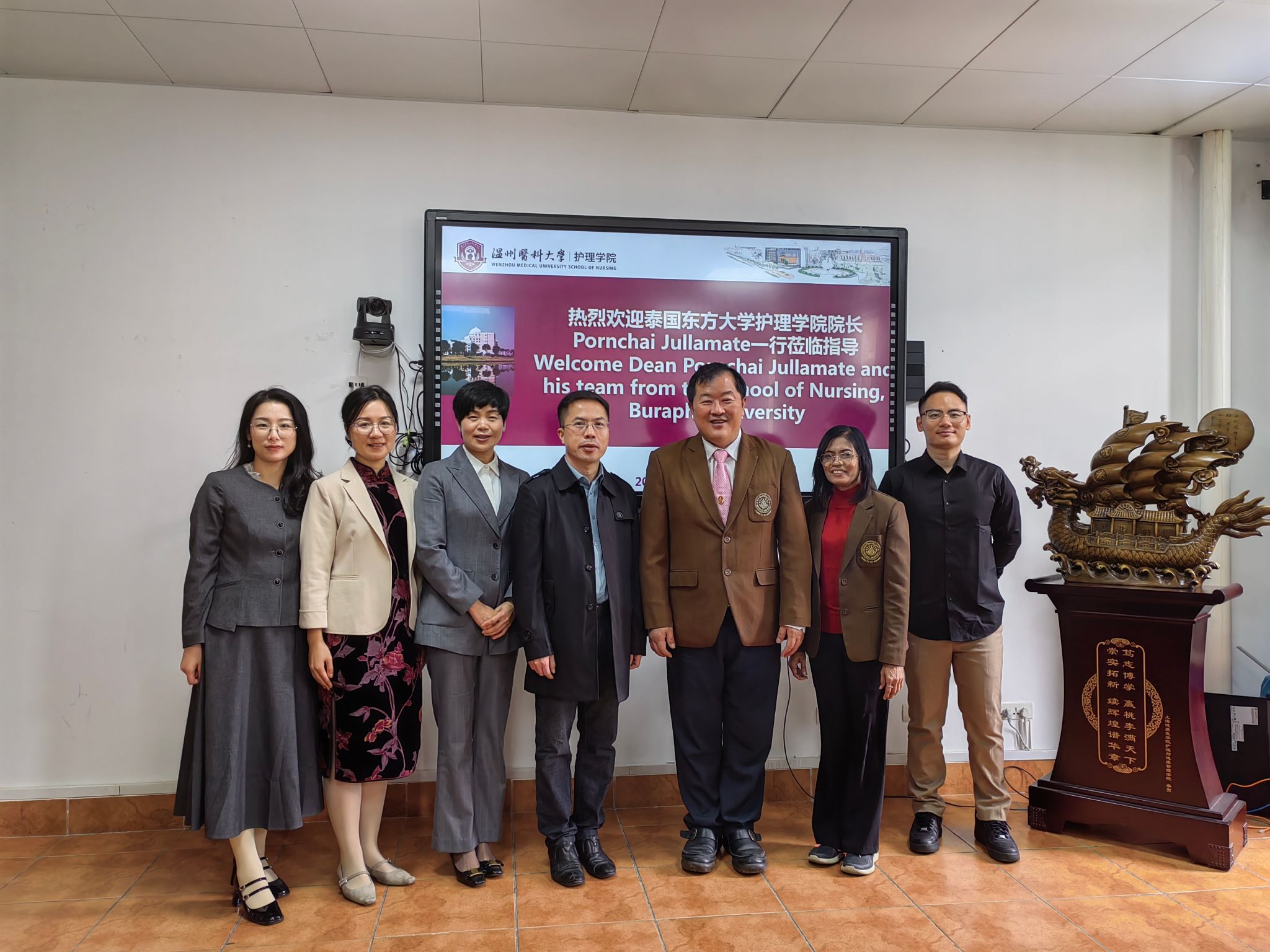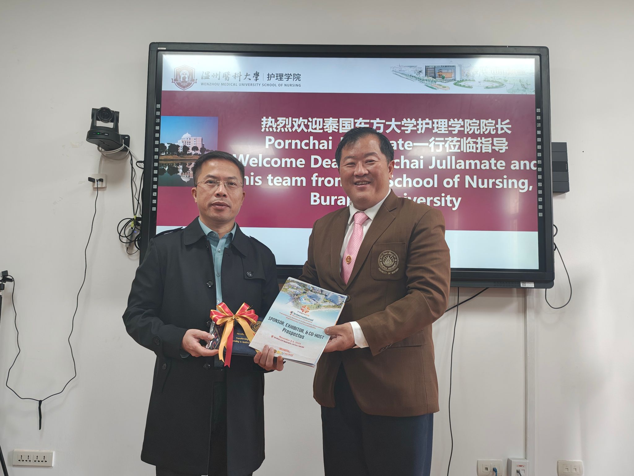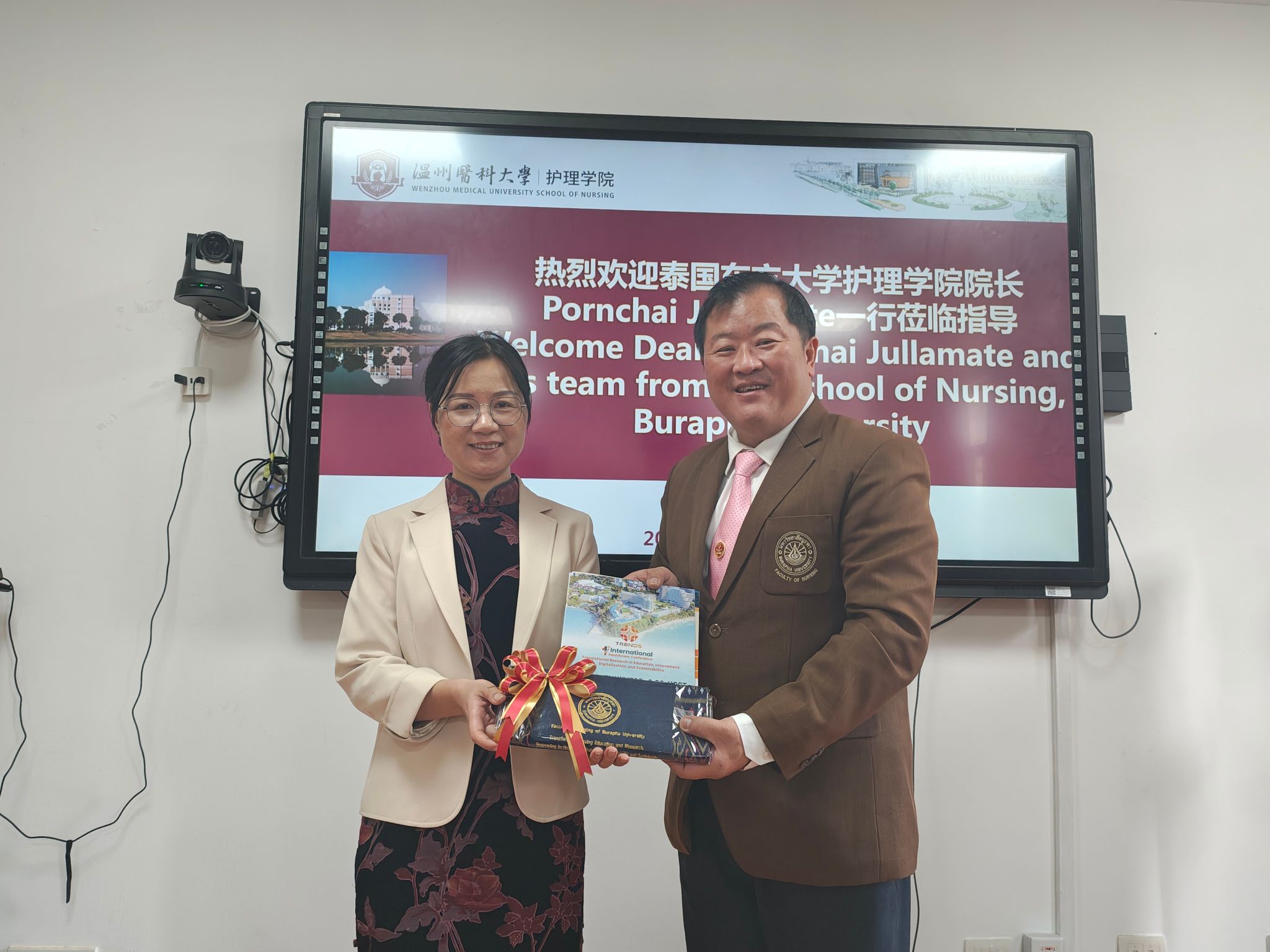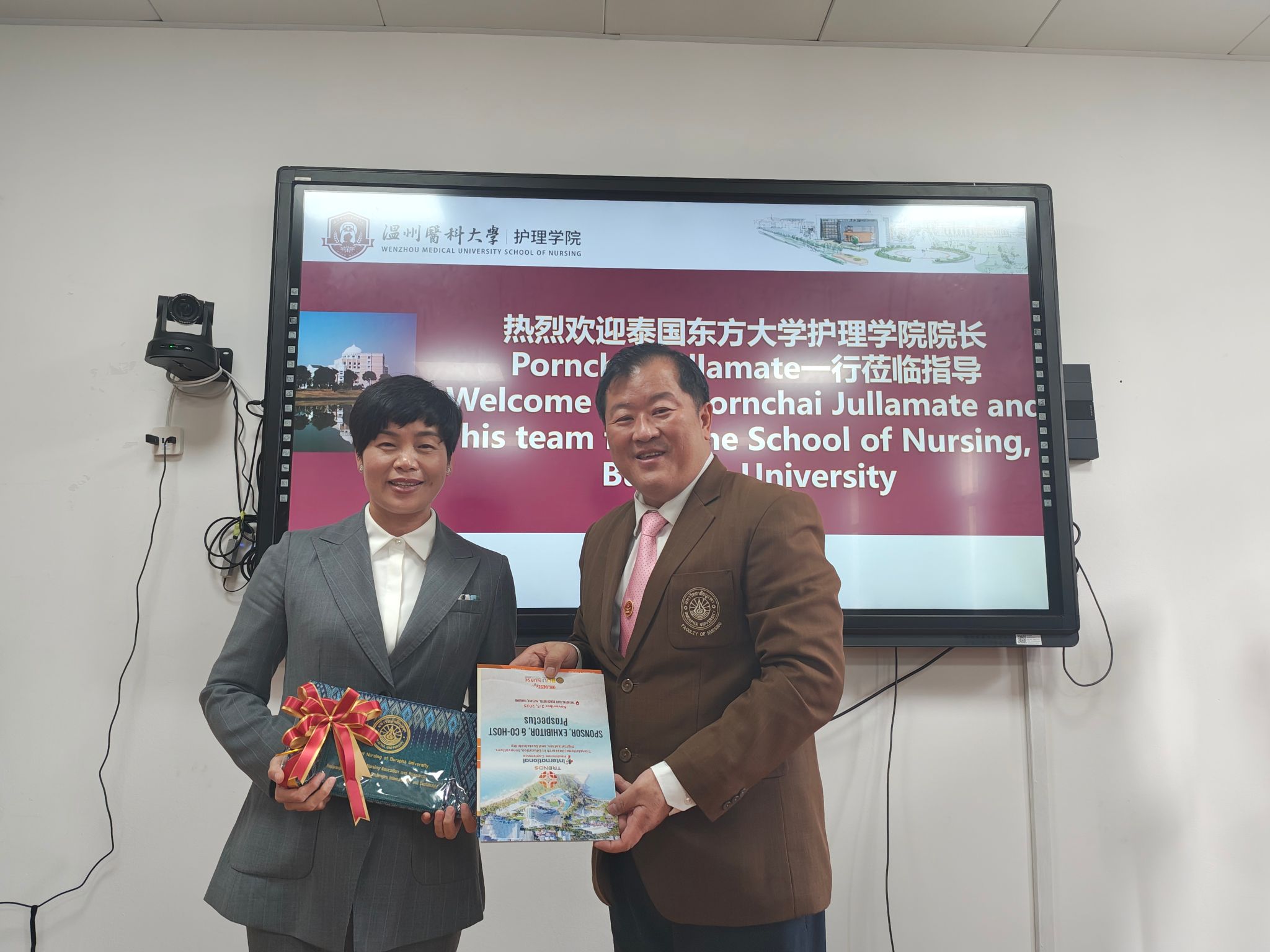会议尾声,Pornchai Jullamate院长向群交 领导赠送了泰国特色礼品,以此表达对双方友谊与合作的珍视。此次会议的成功举办,不仅展示了群交 与泰国东方大学群交 在博士合作上的积极态度与坚定决心,也为中泰护理教育的合作与发展注入了新的活力与动力。双方将携手并进,共同书写中泰教育合作的新篇章。