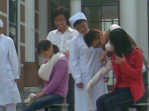 急救知识宣传由急救操作现场演示、急救知识问答和急救海报比赛三个环节组成。日前,群交 白鸽青年志愿者邀请了群交 高年级的学姐给社员做了急救操作示教,并就相关急救知识对社员进行了培训。头部包扎、手臂固定、止血、心肺复苏,同德楼广场上身穿护士服的同学们将所学的操作一步一步地演示给在场所有的同学们。台下的同学也认真地跟着比划着,学习着……接下来进行急救知识回答与海报比赛的,引来了很多同学的停驻,甚至有清洁的阿姨,顿时,广场一片欢声笑语。比赛结果并不重要,重要的是人们对急救的重视。